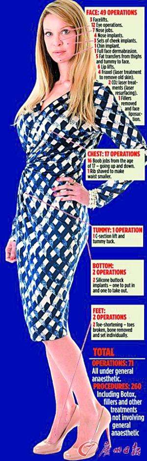她随后陆续接受16次隆胸术、6次隆鼻、11次眼部提升、脸型修整、面部整体提升、腹部除皱、臀部植入、垫下巴、去除下巴植入物等。她还让整形医生帮她缩短肋骨,令身材更苗条;缩短脚趾,“以便穿着高跟鞋时更好看”。