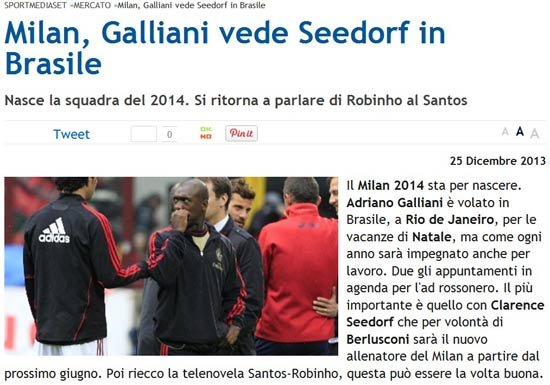 12月25日,是西方传统的圣诞节,但据意大利《慢镜头》消息,加利亚尼在这一天登上了飞赴里约热内卢的班机,加总此行有两个最主要的目的:一是说服西多夫接替阿莱格里担任米兰的新教练;二则是与桑托斯商讨罗比尼奥的转会事宜。